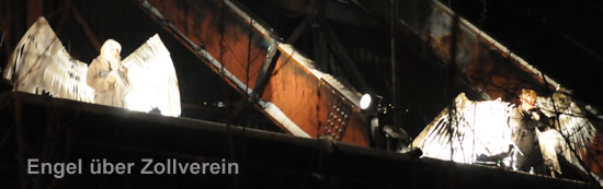 Angels Kaiserkoker Stefan Behr Hungerkummer John Eicke Heilhilf Eckhard Euen Kofferhoffer Uli Gleichmann Immersorge Susanne Kolbe Schwarzwasch Karola Lein Streikbereit Bartel Meyer Flügelfreund Jürgen Weber Characters on the ground Frau Wallies Sabine Henn Herr Zwiebler Jacek Klinke Direction Sybille Behr and Stefan Behr / Theater Anu author Stefan Behr technical director Bartel Meyer design of the wings Elissa Bier design and metallwork structures Zander Jabs/formaffair photograph Alfred Mauve web NAT |