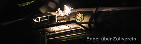 Acht Engel erscheinen beim Eröffnungsfest zur Europäischen Kulturhauptstadt 2010 auf dem Weltkulturerbe Zeche Zollverein in Essen. Sie werden für dreimal 45 Minuten in luftiger Höhe auf der „Schwarzen Seite“ der Kokerei zu sehen sein. Sie sind neben Symbol vor allem Erinnerungsfiguren. Speziell für die Zeche Zollverein verkörpern sie acht Schicksale des ehemaligen Bergarbeiterlebens: Ein Kanarienvogelzüchter, der seine Liebe zu den Vögeln in der Zeche fand, die Tiere wurden in den Stollen mitgenommen um den Sauerstoffgehalt zu testen; ein italienischer Gastarbeiter, der sein Glück bei „Glück auf!“ gefunden hat; eine Bergarbeiterfrau, die sich bei jedem Zu-spät-Kommen um das Leben ihres Mannes sorgte… Zwei Engelforscher sind am Boden mit Fernrohren und einem großem Schalltrichter-Apparat unterwegs. Frau Wallies und Herr Zwiebler kennen ihre Engel auf Zollverein und lassen die Menschen an ihnen und ihren Geschichten teilhaben. |