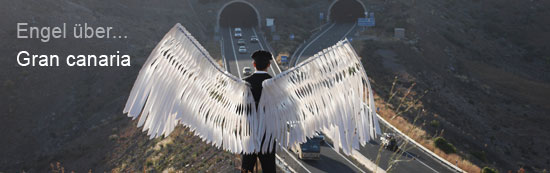 Puerto de Mogán, Telde, Arucas, Gáldar. An einer Autobahn zwischen Tunnel, auf einem Berg oder einem sehr hohen Gebäude erscheint ein Engel.